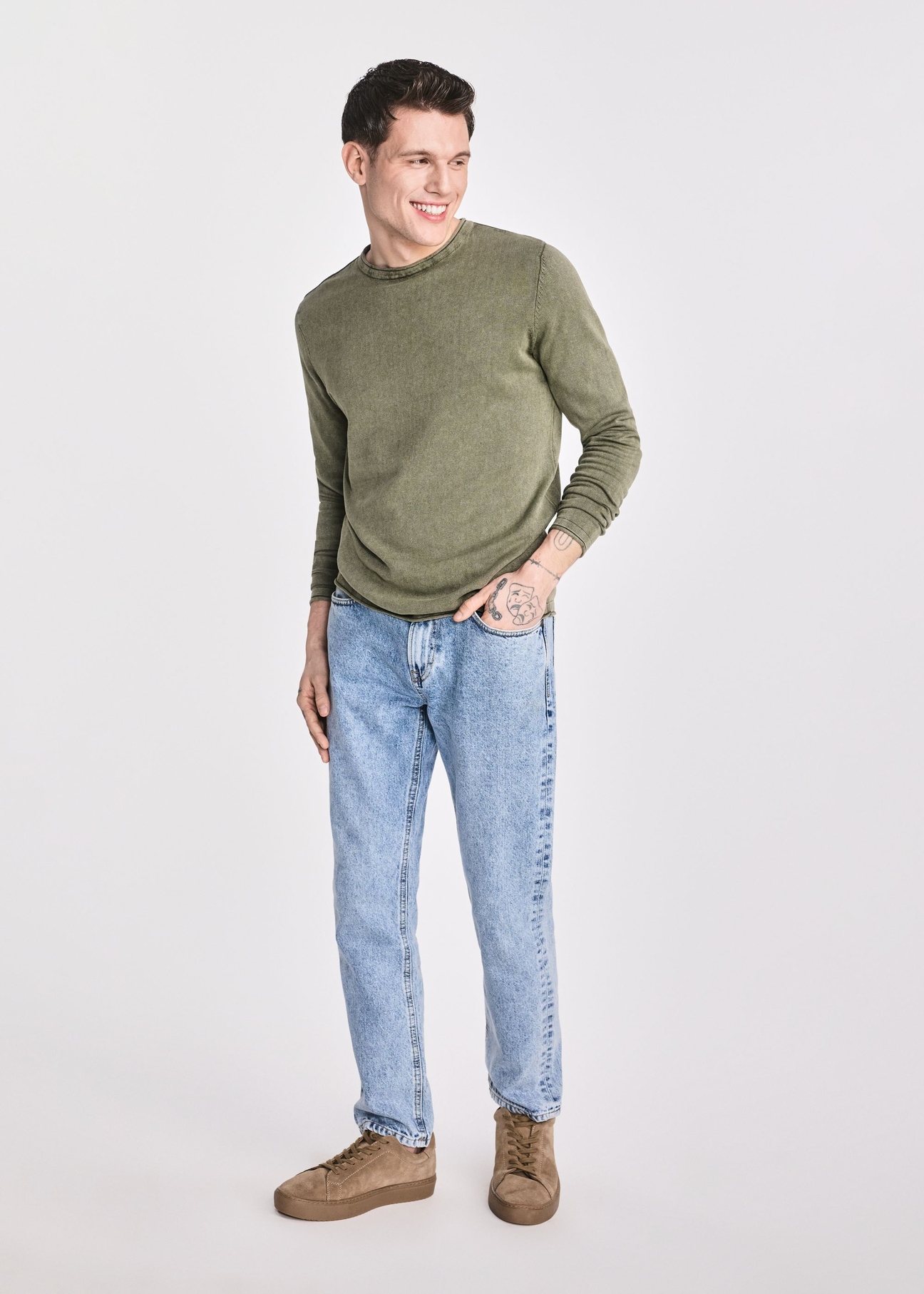 Univerzálny khaki odtieň sa hodí ku každej outfitovej kombinácii, či už ležérnej alebo elegantnejšej. Efekt vyprania dodáva svetru originálny vzhľad s vintage nádychom, ktorý zvýrazňuje jeho charakter. Priliehavý strih zvýrazní vašu postavu a zároveň zaručí pohodlie počas celého dňa. Dlhý, rovný rukáv je klasickým riešením, ktoré skvelo doplní akýkoľvek outfit. Sveter sa perfektne kombinuje s džínsami, chinos nohavicami alebo koženými doplnkami.