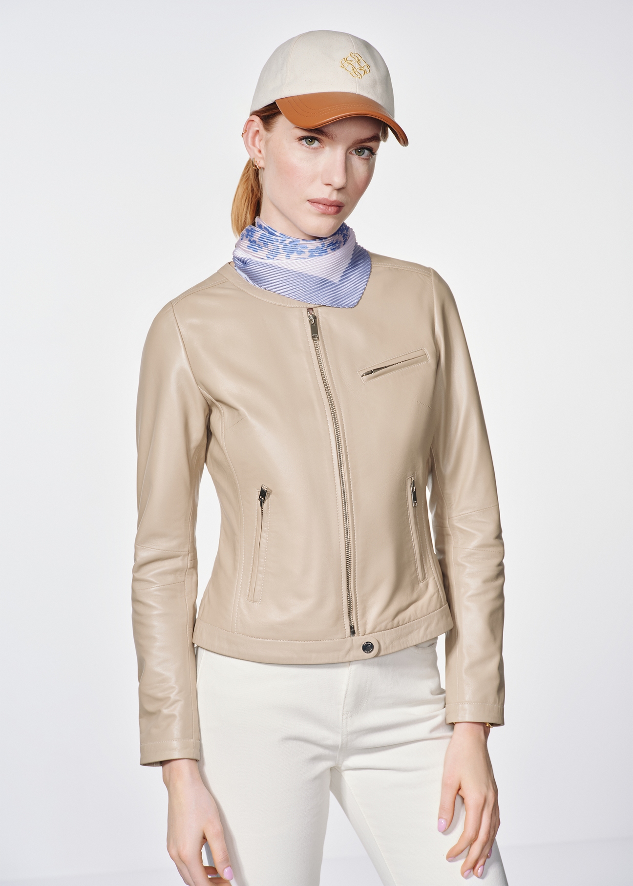 Model je vyrobený z prírodnej ovčej kože typu Nappa, ktorá sa vyznačuje nielen mäkkosťou, ale aj odolnosťou voči nečistotám a vlhkosti. Kvapky vody neprenikajú do materiálu, ale voľne stekajú po jeho povrchu, čo zaručuje väčší komfort pri nosení. Bunda má priliehavý strih, ktorý zvýrazňuje postavu, a okrúhly výstrih spolu s jemnými detailmi jej dodávajú osobitý charakter. Tri funkčné vrecká na zips zabezpečujú praktickosť – môžete si do nich uložiť všetky potrebné drobnosti. Model sa zapína na zips, čo uľahčuje obliekanie a vyzliekanie, a manžety zakončené cvokmi umožňujú reguláciu. Celok dopĺňajú kovové prvky vo farbe svetlého niklu.