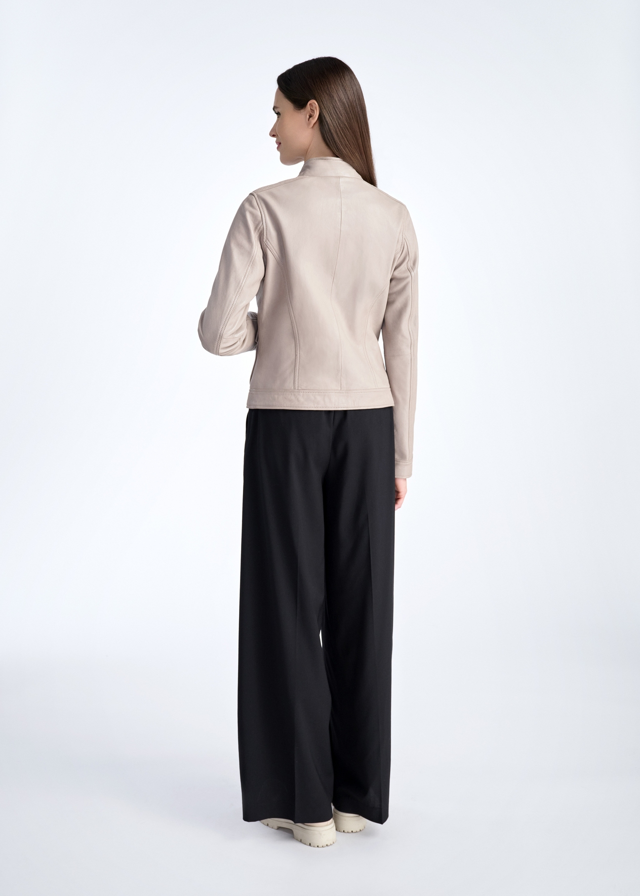 Béžová kožená bunda motorkárskeho štýlu je investíciou do nadčasového vzhľadu a spoľahlivej kvality. Skvele sa hodí na každodenné nosenie aj na špeciálne príležitosti, pričom vašim outfitom dodá eleganciu a sofistikovanosť. Vyzerá výborne v kombinácii s nohavicami aj šatami.
