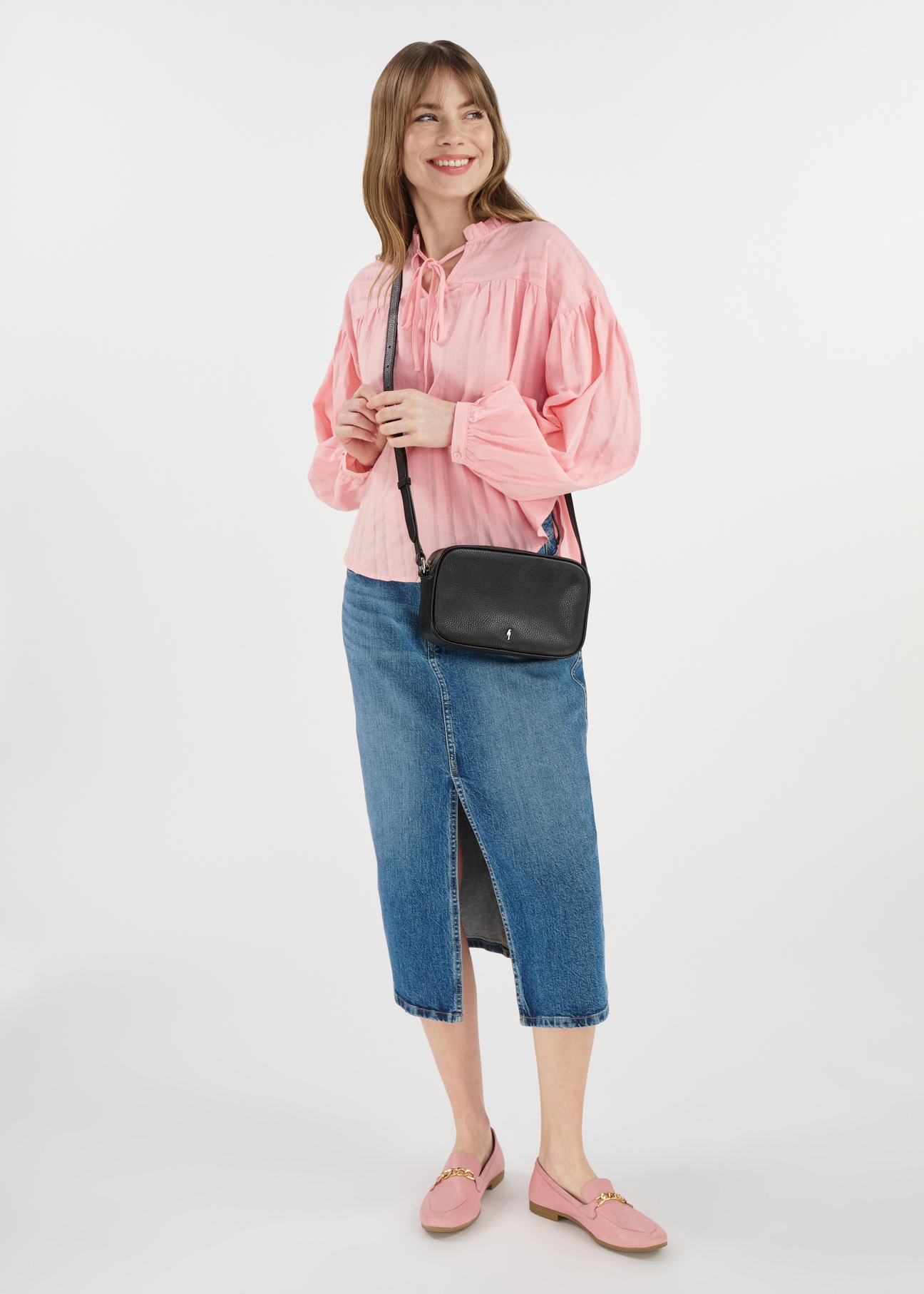 Jednokomorový model vyrobený z kvalitnej prírodnej kože. Taška sa uzatvára na zips, ktorý zaručuje bezpečnosť obsahu. Vo vnútri sú ďalšie dve vrecká, z toho jedno na zips. Vďaka nastaviteľnému popruhu ju môžete nosiť dvoma spôsobmi – na ramene alebo cross body. Strieborné kovové prvky dodávajú eleganciu vrátane jemného loga na prednej stene.