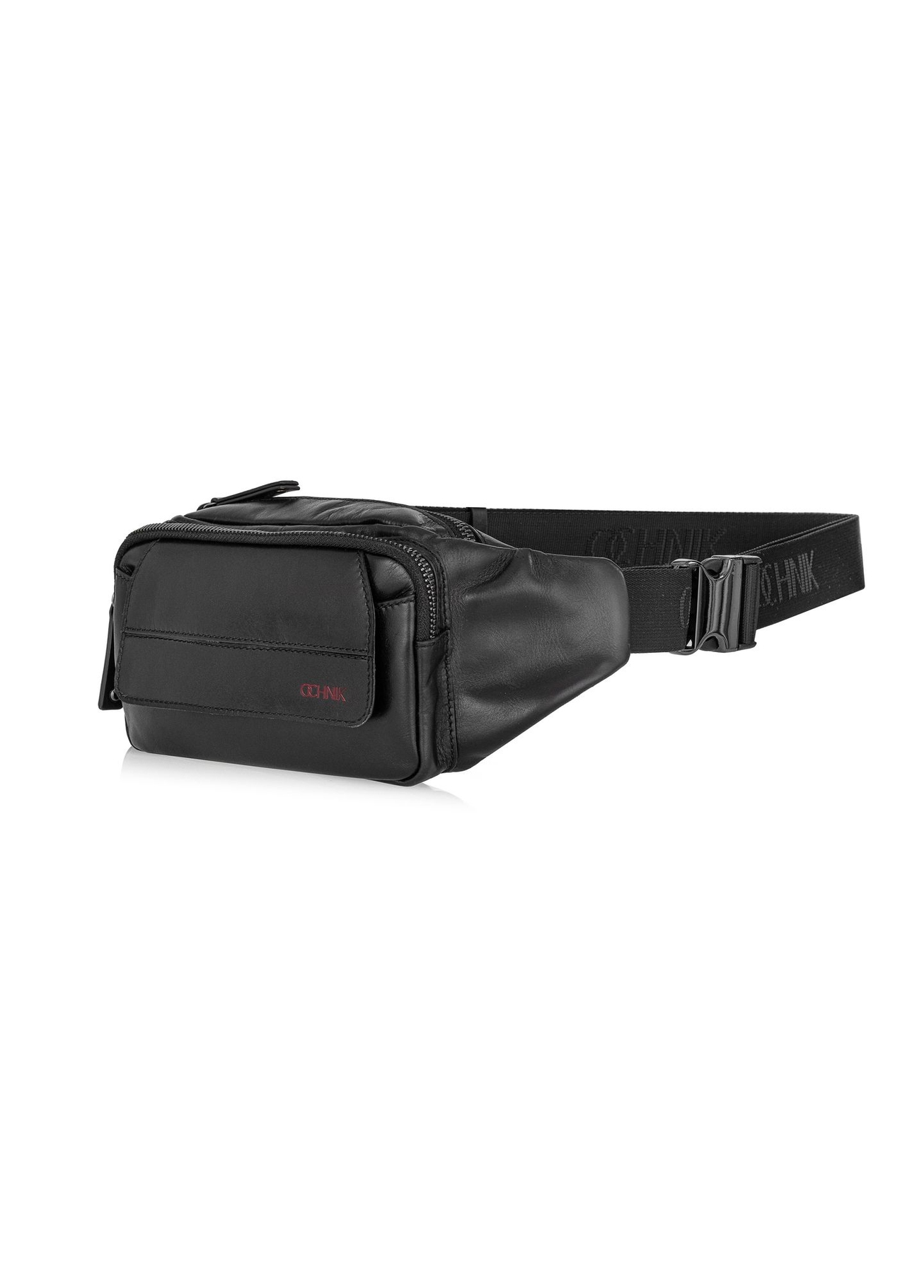 Čierna kožená pánska ľadvinka vyrobená z prírodnej kože je skvelou voľbou pre každého muža. Dvojkomorový model so zapínaním na zips ponúka vynikajúcu organizáciu vďaka dvom vonkajším vreckám – jedno na zips a druhé na magnetické zapínanie. Vo vnútri sa nachádza ďalšie vrecko na zips. Ľadvinka má nastaviteľný, neodnímateľný popruh s logom značky a červený emblém, ktorý jej dodáva moderný vzhľad. Nastaviteľný popruh umožňuje nosenie na bokoch alebo crossbody.