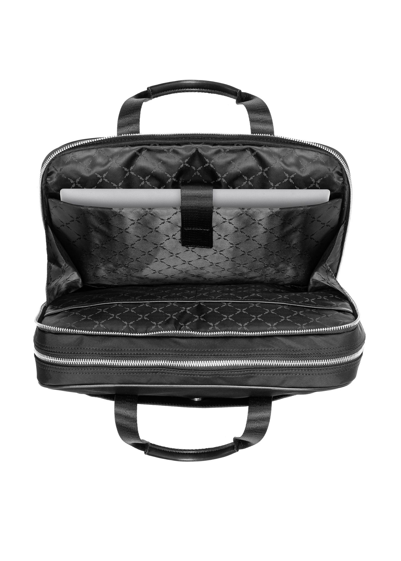 Čierna farba tašky je nadčasová a univerzálna a signovaná podšívka dodáva luxusný charakter. Kovové prvky striebornej farby a znak značky na prednej strane zdôrazňujú vysokú kvalitu spracovania a elegantný štýl.