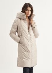 Dámska bunda vyrobená z polyesteru s prímesou strečovej tkaniny v béžovej farbe , zateplená syntetickým páperím. Model má priestrannú kapucňu so šnúrkami na nastavenie. Rukávy sú zakončené rebrovanými manžetami pre lepšiu ochranu pred chladom. Model má nenápadné zipsy vo výške stehien pre väčšiu voľnosť pohybu. Tento priliehavý model ponúka širokú škálu možností na vytváranie zaujímavých variácií, čím vytvára dokonalý a jedinečný vzhľad.