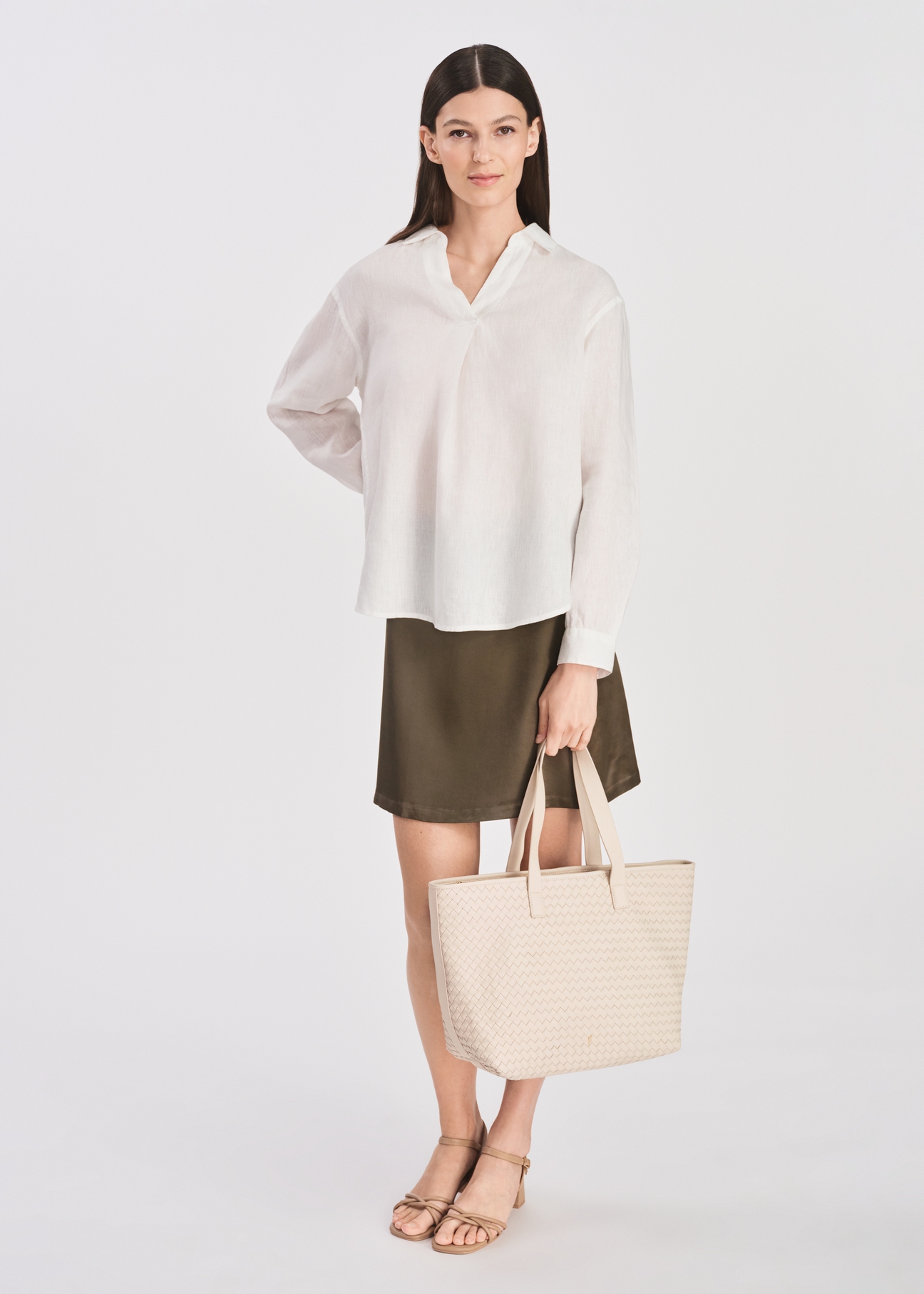 Kabelka je vyrobená z prvotriednej prírodnej kože, ktorá zaujme svojou mäkkou štruktúrou a odolnosťou. Pletený povrch jej dodáva jedinečný charakter a jemný krémový odtieň umožňuje ľahké kombinovanie s rôznymi outfitmi – od každodenných až po elegantné. Kabelka má jednokomorový strih, ktorý poskytuje dostatok priestoru a pohodlie pri nosení. Zapína sa na zips, vďaka čomu sú vaše veci vždy v bezpečí. Interiér je podšitý podšívkou s logom značky a obsahuje tri praktické vrecká, z toho jedno na zips, ktoré pomáhajú udržať poriadok v drobnostiach každodennej potreby.