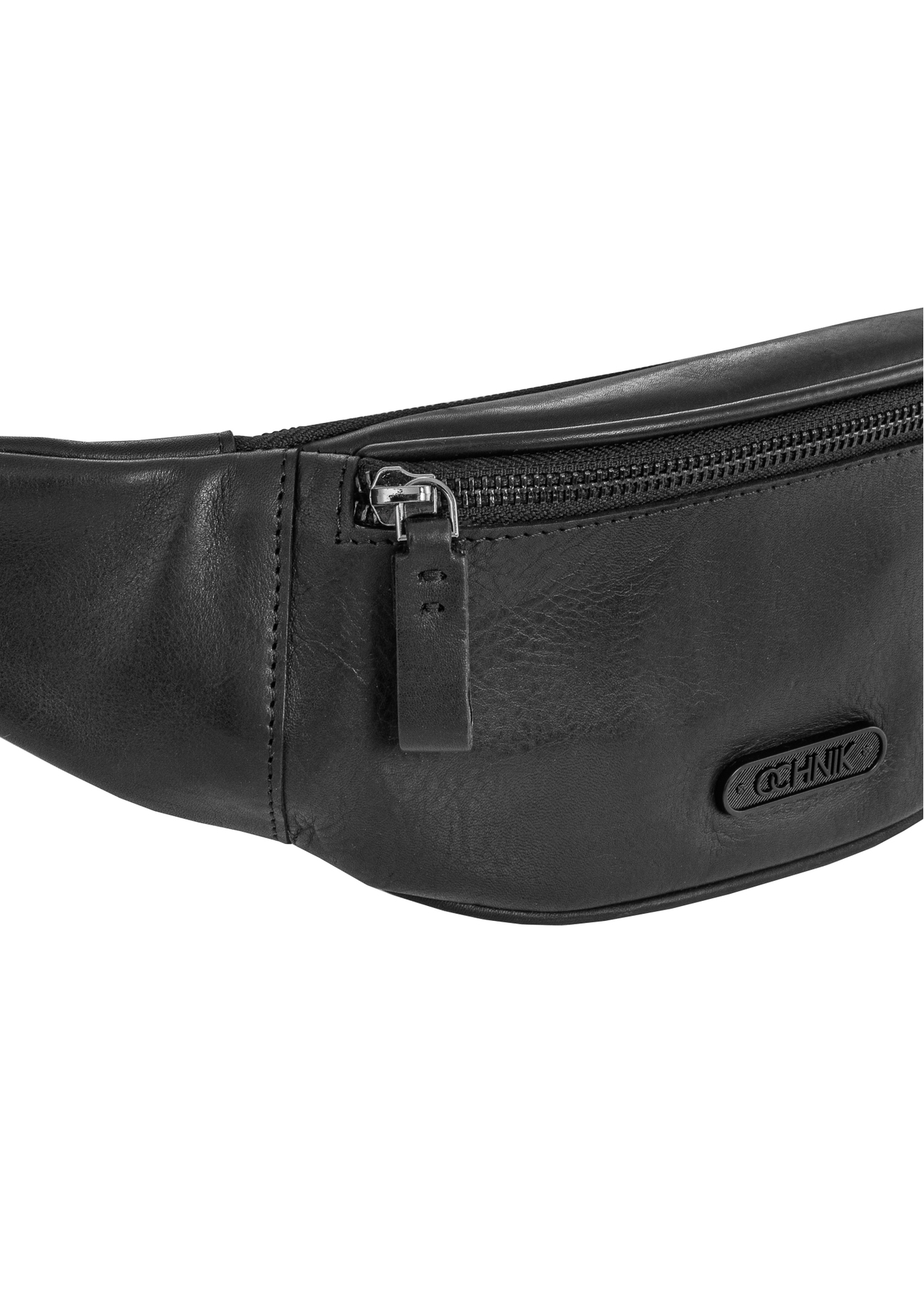 Pánske vrecúško v čiernej farbe. Vrecko je vyrobené z hladkej štruktúrovanej prírodnej kože a vďaka nastaviteľnému zapínaniu na patentky sa dá pohodlne nosiť na bokoch.