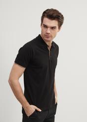 Pánske polo z bavlny. Krátke rukávy zakončené rebrovanými manžetami s kontrastnými prvkami. Zapínanie na tri gombíky pod golierom. Grafický symbol značky OCHNIK – volavka – je vyšitý na ľavej strane hrude.