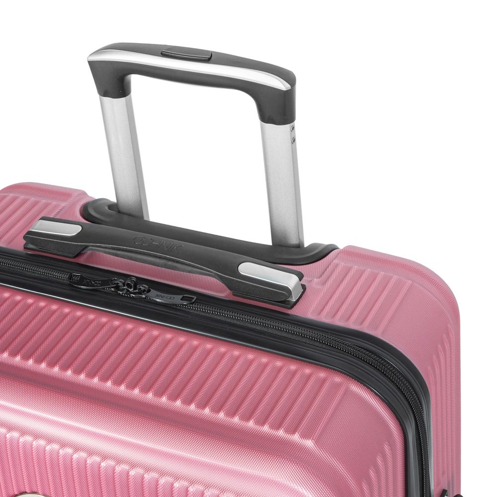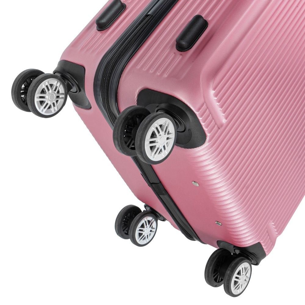 Stredný kufor s tvrdou škrupinou aerodynamického tvaru v v ružovej farbe. Vyrobený z veľmi ľahkého a pevného materiálu ABS, odolného voči poškodeniu. Dvojité kolieska vyrobené zo zmesi gumy a kaučuku, osadené ložiskami, umožňujú obracanie o 360°. Vo vnútri je kufor rozdelený na dve časti – jedna priehradka je uzavretá látkou na zips, druhá zabezpečená elastickými popruhmi.